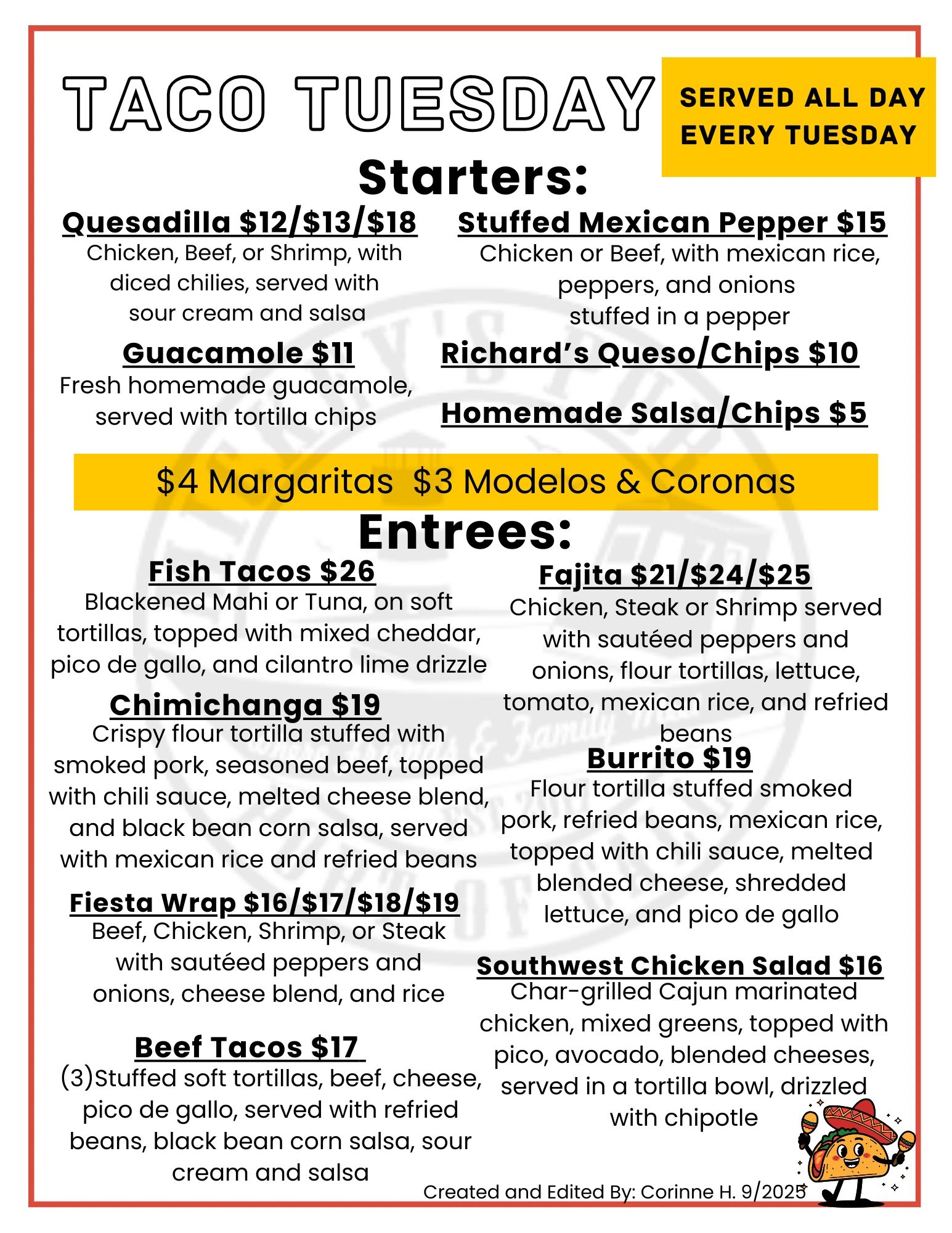 3 Stuffed Soft Tortilla Tacos, w/ Beef, Cheese, Pico de Gallo, Served w/ Re-Fried Beans, Black Bean Corn Salsa, Sour Cream, Salsa & Guacamole
